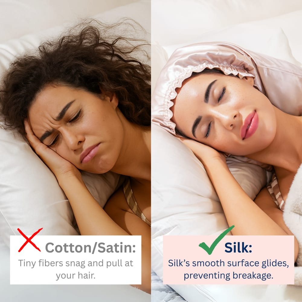 Dr. Aleksandra Brown, a board-certified dermatologist, explains: "Silk's smooth surface creates less friction against hair strands, which means less breakage, less frizz, and better moisture retention overnight."