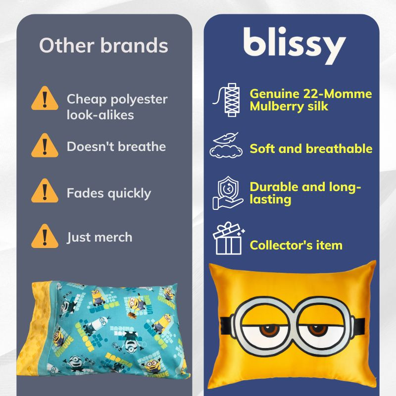 Clinical studies show 85% enjoyed longer, less interrupted sleep with Blissy's temperature-regulating silk that stays cool all night. No more pillow-flipping! Now imagine drifting off with your beloved White Lotus or Minion designs while enjoying the perfect sleep temperature and luxurious comfort.