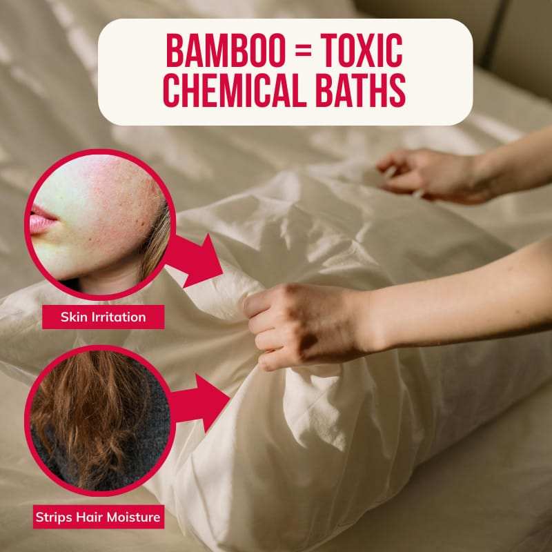 Bamboo sounds natural and eco-friendly, but the truth is shocking: to turn bamboo pulp into fabric, companies soak it in toxic chemical baths that strip away anything natural. What’s left is a limp, wrinkled fabric that loses shape fast, traps heat, and offers none of the cooling or protective benefits you were promised. Instead of being sustainable, bamboo pillowcases are wasteful, short-lived, and full of residues you don’t want near your face. Blissy is the truly eco-friendly option. Our silk is OEKO-TEX certified, meaning it’s tested for harmful chemicals and guaranteed safe for you and the planet. And unlike bamboo, Blissy’s time-honored weaving process produces a fabric that lasts for years while staying luxuriously smooth and naturally cooling.