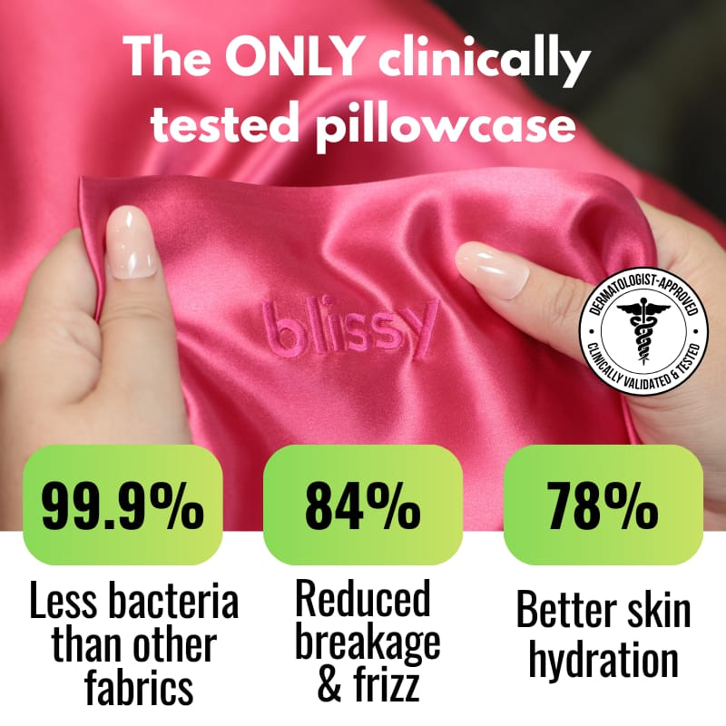 Every Blissy pillowcase is carefully crafted by skilled artisans with a proprietary weave that enhances durability, smoothness, and breathability. But what truly sets Blissy apart is that its benefits go beyond luxury — they’re clinically proven.Unlike other pillowcase companies that rely on marketing claims, Blissy has invested in real clinical studies. Independent labs have tested Blissy against regular pillowcases using scientific methods. The results are impressive: 90% of users reported clearer skin, 38.71% showed improved skin radiance, and 45.16% experienced better skin texture after just 30 days. Hair frizz was significantly reduced compared to cotton pillowcases. These aren't testimonials or surveys – they're controlled studies with measurable results. Dr. Luke Maxfield, MD notes: 'As the only clinically-tested silk pillowcase on the market, Blissy's studies show clearer, more hydrated skin after just six weeks of use.' The studies also tested durability. While cheap pillowcases showed wear and tear quickly, Blissy maintained its smoothness and integrity even after multiple washes. We put this level of care into every Blissy because we believe in our products — and now, with clinical results to back it up, you can believe in them too.