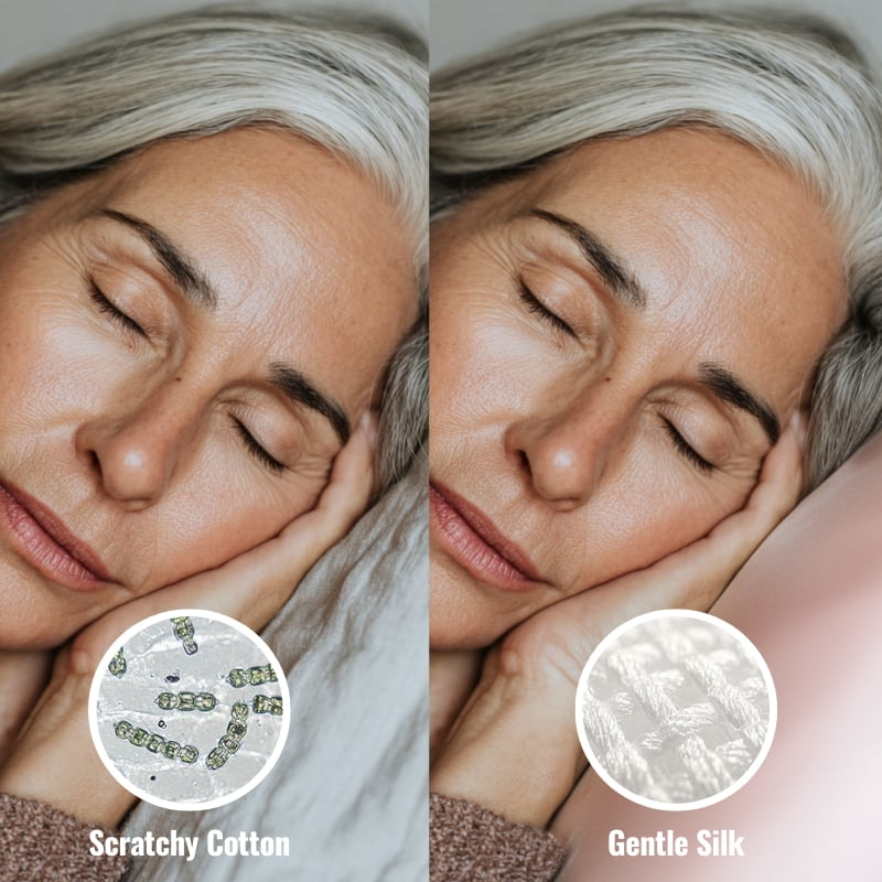 Most pillowcases, whether cotton or satin, create friction that pulls at your skin and tugs at your hair all night long. As we age and skin becomes more delicate, that constant rubbing can accelerate fine lines, irritation, and dryness.